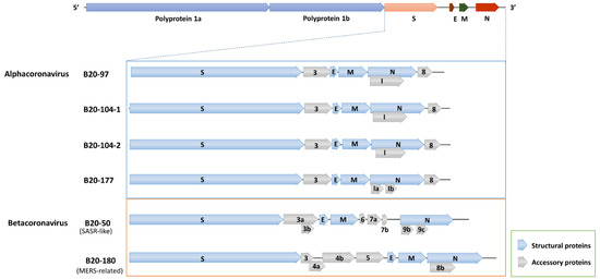 Genome organization of six strains. The general genomic structure is depicted at the top. The expanded regions below show the structural and accessory protein in the 3′ regions of the αCoVs (B20-97, B20-104-1, B20-104-2, and B20-177) and βCoVs (B20-50 and B20-180). The expanded regions are drawn to scale.