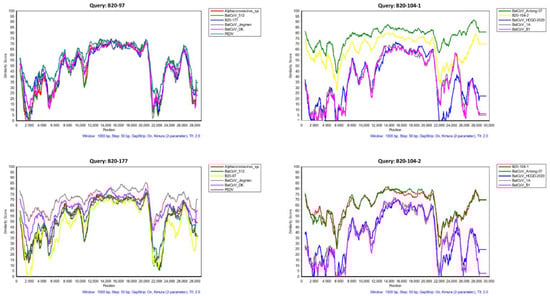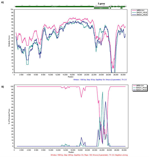 We further focused on the spike protein, which is responsible for receptor binding and virus entry. Based on our analysis, recombination events were observed among the S gene of the B20-180 strain and two sequences belonging to the Merbecovirus subgenus. At least two breakpoints were identified among RBD and the S2 subunit of S gene by BootScan (RDP4), breakpoints at 24467–24742 (nt) from parent HKU4 and breakpoints at 24743–25154 (nt) from parent HKU5 as supported by BootScan p-value of 9.765 × 10−10 and 3.883 × 10−10, respectively. The potential recombination events were confirmed using the similarity plot and BootScan analyses implemented in Simplot (Figure 6).
