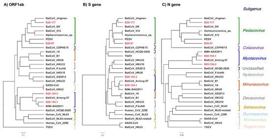 In all the analyzed genes (Figure 4), B20-97 and B20-177 were most closely related to PEDV and BatCoV_Jingmen, respectively, and these viruses cluster with bat CDPHE15. Taken together, we suppose that B20-97 and B20-177 are putative species under subgenus Pedacovirus. In B20-104-1 and B20-104-2, they are closely related to BtMr-SAX2011 and BatCoV Anlong-57. In the ORF1ab gene and N gene trees, their species group clusters with a putative new species BatCoV HCQD-2020. However, they also cluster with BatCoV_1A in the S gene tree.