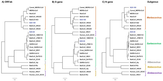 Phylogenetic trees (Figure 5) showed that B20-50 is closely related to SARS-related BatCoV-JTMC15 and BatCoV_16BO133, under the subgenus Sarbecovirus. The MERS-related B20-180 strain is more closely related to other bat MERS-related CoVs than MERS-CoV based on the ORF1ab gene tree. In contrast, the S gene tree showed that the strain is closely related to strain Bat-CoV-422 and, together, these cluster with HKU4 virus. Based on the N gene, the B20-180 is separated from all MERS-related CoVs within the Merbecovirus subgenus.