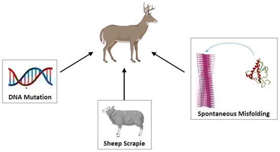 Another typical characteristic of prions in common with conventional micro-organisms is their capacity to infect only some animal species, a phenomenon usually referred as “species barrier” [86,87]. The ability of prions from one species to infect animals from a different species depends on the sequence homology between the prion protein from donor and acceptor as well as the specific prion strain properties of the infectious material [86,87]. Cervids cohabit in nature with several animal species susceptible to prion infection, such as livestock, rodents, scavengers, carnivores, pets, and humans (Figure 2) [7]. Particularly at risk are predators and scavenger animals, which may consume CWD-infected carcasses, but also herbivores through exposure to contaminated environment, including plants and soil. Several studies of experimental infection with CWD prions showed that CWD can transmit disease to various animal species, including cattle, sheep, goats, ferrets, and raccoons [88,89,90,91,92,93,94]. Interspecies transmission typically results in a lower attack rate (proportion of animals developing the disease out of the total number of animals exposed) and longer incubation periods compared to CWD transmission to cervids. Importantly, CWD transmission to other animal species may increase the virulence and zoonotic potential of newly generated prion strains in the host animals [2]. This appears to be the case of scrapie passaged into cattle. While traditional scrapie in sheep is considered not infectious to humans, cattle infected by scrapie can infect humans producing variant CJD (vCJD) [95].