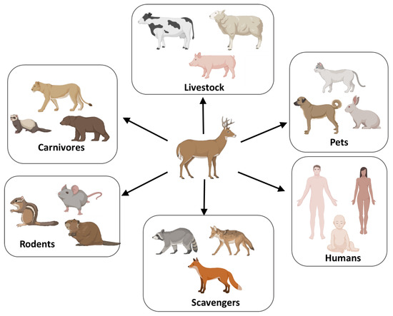 Animal species susceptible or at risk to be infected with CWD. Various animals cohabit with cervid, including livestock, rodents, scavengers, carnivores, domestic animals, and humans. Several studies of experimental infection of animals by CWD have shown that sheep, goats, cattle, ferrets, raccoons, and rodents can be infected with CWD [88,89,90,91,92,93,94].