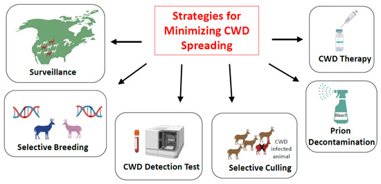 An overview of various strategies to minimize CWD spreading. Various alternative approaches have been proposed to decrease the risk of further CWD spreading, including detailed surveillance, selective breeding of animals harboring rare polymorphisms partially resistant to CWD, development of a highly efficient test for CWD detection, selective culling of infected animals, prion decontamination, and development of a treatment for CWD.