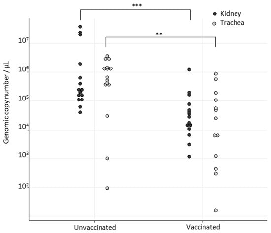 Comparison of relative mean of D388 viral RNA in both tracheas and kidneys of vaccinated and unvaccinated subjects. Statistical tests (comparison of mean of two independent samples) were performed using Wilcoxon test. ** p-value below 0.001; *** p-value below 0.0001.