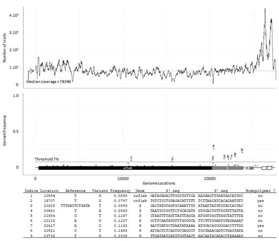Genetic variant map of the EggP1 D388 inoculum. EggP1 D388 inoculum was deep sequenced and NGS data were processed through VVV. The upper graphic shows genome coverage, While the middle graphic presents detected genetic variants over the viral genome; numbers = variants above the threshold. The table provides the details of the detected genetic variants (1–9).