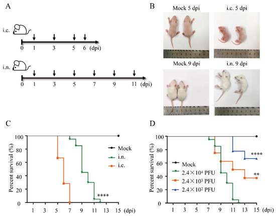 DENV-2 infection via the intranasal route is lethal in BALB/c suckling mice. (A) Experimental scheme. Three days after birth, the newborn BALB/c suckling mice were challenged intracranially or intranasally with DENV-2. The body weight, clinical phenotypes, and mortality rates were evaluated. The organs (heart, liver, spleen, lung, kidney, and brain) and blood of the challenged suckling mice were harvested (black arrow). (B) Representative images of intracranially or intranasally challenged BALB/c suckling mice. (C) Survival probability of DENV-2 challenged suckling mice infected via intracranial or intranasal routes. Survival conditions were monitored daily after challenge (titer = 2.4 × 104 PFU; i.c., n = 21; i.n., n = 20; mock, n = 8). (D) Survival probability of intranasally infected suckling mice with different titers of DENV-2. Abbreviations: i.c., intracranial; i.n., intranasal; dpi, day post inoculation; PFU, plaque forming unit. Log rank test; ****, p < 0.0001; **, p < 0.01.