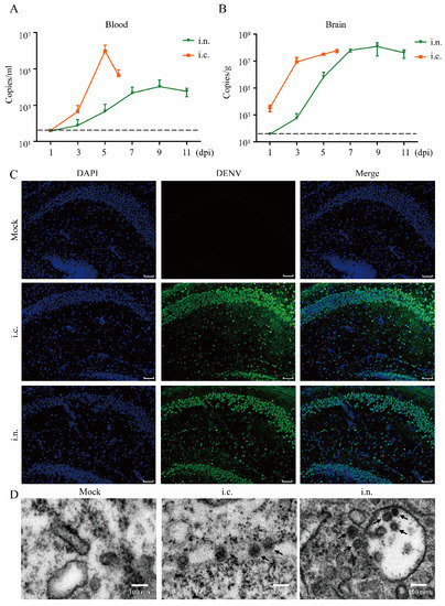 Infection status of DENV-2 challenged suckling mice. (A) Blood samples were harvested, and viremia was evaluated (each time point, n = 4 or n = 5). The dotted black line indicates the limits of detection. (B) Brain samples were harvested, and the virus titer was evaluated using RT-PCR (each time point, n = 4 or n = 5). (C) Immunostaining of the hippocampal CA1 and CA2 area from intracranially and intranasally challenged mice at the severe illness phase (5 and 9 dpi, respectively). Scale bar: 50 μm. (D) Representative transmission electron micrographs showing viral particles in DENV-2 challenged suckling mouse brains. Black arrows, viral particles. Abbreviations: i.c., intracranial; i.n., intranasal; dpi, day post inoculation.