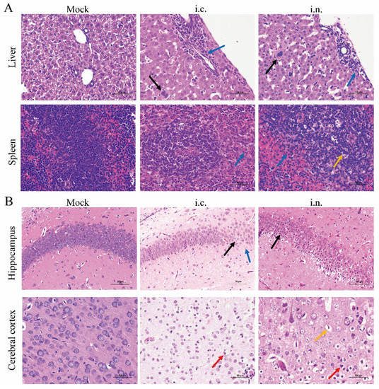 Next, we characterized the pathological changes that occurred in the challenged suckling mice. Despite the lower viral loads in the organs besides the brain, intranasal infection with DENV-2 resulted in substantial pathological changes in the liver and spleen of the moribund mice. The histopathological phenotypes were comparable between the intranasally and intracranially challenged mice with moderate inflammatory cell infiltration and the presence of a few multinucleated giant cells in the liver, as well as numerous apoptotic bodies and inflammatory cell infiltration in the spleen (Figure 3A). No obvious histopathological changes were observed in other organs (Supplementary Figure S3). Histopathological changes in the brain tissue were observed in the hippocampus and cerebral cortex in both intracranially and intranasally challenged mice. In the intracranially challenged mice, a substantial number of necrotic pyramidal cells with pyknotic, broken, or dissolved nuclei, eosinophilic cytoplasm, and mild gliocyte proliferation were identified in all areas of the hippocampus (Figure 3B, Supplementary Figure S4). Moderate pyramidal cell necrosis was observed in the CA2, CA3, and DG areas of the hippocampus in the intranasally challenged mice (Figure 3B, Supplementary Figure S4). The predominant histopathological changes in the cerebral cortex were neuronal necrosis and vacuolization, which were mild in the intracranially challenged mice, but were profound in the intranasally challenged mice (Figure 3B).