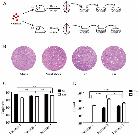 Moribund suckling mice were sacrificed and anatomized to harvest their brains at 5 or 9 dpi (intracranially or intranasally inoculated mice, respectively). The brain was quickly ground with PBS and centrifuged to obtain the supernatant as isolates. Vero cells were transfected with 100-fold diluted isolates when the confluency reached 80%. After incubated for 2 h, Vero cells were maintained in DMEM medium (Gibco, Grand island, NY, USA) supplemented with 2% FBS (Gibco, Grand island, NY, USA) at 37 °C in an atmosphere with 5% CO2. Seven days later, the culture medium and cells were collected, and this constituted one passage. Additional passages were performed using the same method with 10-fold dilutions of the early generation viral stock. Viral RNA was detected using qRT-PCR, as described above, and viral titers were evaluated using the plaque assays.