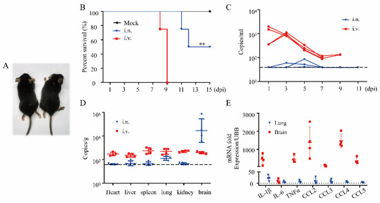 DENV-2 infection via the intranasal route is lethal in A6 mice. (A) Representative images of intranasally challenged A6 mice with neurological symptoms. (B) Survival probability of DENV-2 challenged A6 mice administered the virus via the intravenous or intranasal routes. Survival conditions were monitored daily after challenge (titer = 2.4 × 105 PFU; i.v., n = 4; i.n., n = 4; mock, n = 4). **, p < 0.01. (C) Viremia in A6 mice after DENV-2 inoculation. (i.v., n = 4; i.n., n = 4). Dotted lines indicate the limits of detection. (D) Internal organ samples were harvested, and the virus titer was evaluated (i.v., n = 4; i.n., n = 4). (E) Expression of pro-inflammatory factors in the brains and lungs of moribund A6 mice. Abbreviations: i.v., intravenous; i.n., intranasal; dpi, day post inoculation.