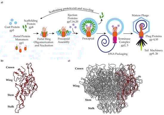 (a) Bacteriophage P22 assembly pathway; (b) single PC portal protein subunit; (c) PC portal protein complex (PDB: 5JJ1) [19].