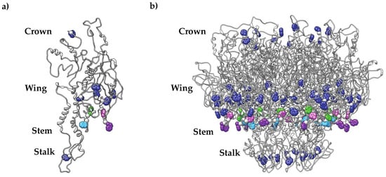 Tryptophan residues in the portal protein wing domain targeted for site-directed mutagenesis. Residues W41, W44, W207 and W211 present in the wing domain are colored green, light blue, purple and pink, respectively. All other tryptophan residues are colored dark blue. (a) Single PC portal protein subunit; (b) PC portal protein complex (PDB: 5JJ1).