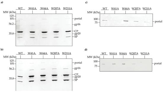 The incorporation of the W to A portal protein mutants into PCs are shown in Figure 3. A band corresponding to portal protein was present in the PC region for all variants at 30 °C (Figure 3a). The W41A portal protein band was much less intense (very faintly visible to the eye), suggesting that it does not incorporate well compared to the other mutant portal proteins at 30 °C. At 37 °C, the WT, W41A, W44A and W207A portal proteins were each incorporated into PCs, suggesting that the substitutions did not disturb portal-scaffolding protein binding, though the band of W207A portal protein was less intense than the other samples (Figure 3b). However, no portal protein band was observed in the PC peak of the sucrose gradient of the W211A lysate at 37 °C (Figure 3b), indicating a defect in portal protein recruitment at this temperature. These results were further confirmed by Western blot analysis (Figure 3c,d).