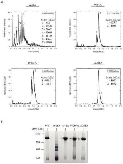 The decreased efficiency in portal protein incorporation for some of the W to A portal protein mutants could be caused by improper portal protein ring assembly. The portal proteins of dsDNA bacteriophages and herpesviruses are incorporated into PCs in vivo as dodecameric ring-like structures. The oligomeric states of ectopically expressed portal proteins can range from 11-mers to 14-mers [20,21,23,34,51]. However, in bacteriophage P22, charge detection mass spectrometry (CDMS), which measures the mass of native protein complexes [44,45,46] was previously used to demonstrate that in vitro assembled WT portal protein rings primarily exist as 12-mers [15]. To determine if there were mutant-specific defects in portal protein polymerization, we again used CDMS to probe the oligomeric state of in vitro assembled mutant PC portal rings. Briefly, the his6-tagged portal proteins were purified by metal affinity chromatography, then concentrated to ~100 mg/mL and incubated at room temperature (~22 °C) for 48 h, which generates PC portal rings [15,19]. The proteins were purified twice by size exclusion chromatography to eliminate aggregates and contaminating portal monomers (PMs). Previous studies have confirmed that the WT his6-tagged portal protein is functional in vivo and competent for ring assembly in vitro [43]. The mass spectrum of WT PC portal contained a 12-mer peak in addition to lower mass peaks, as previously observed (data not shown) [15]. While dodecameric rings were the dominant species in the spectrum of the W211A mutant, the spectra of the W44A and W207A portal proteins consisted of a mixture of 11-mer and 12-mer peaks (Figure 4a). In contrast, there were no peaks corresponding to 11-mers or 12-mers in the spectrum of the W41A mutant, but rather, a mixture of oligomers from monomers to 8-mers was observed (Figure 4a). These observations were further supported by a blue native bis-tris 4–16% gel in which all PC portal rings, except for the W41A mutant, migrated to the ~1-MDa position of WT PC portal rings (Figure 4b). The CDMS data indicate that alanine substitutions at positions 44, 207 and 211 of the portal protein did not prevent the assembly of dodecameric portal protein rings, whereas residue 41 was critical to the formation of stable, higher order dodecameric portal assemblies. In addition, while the W41A mutation was destabilizing, the W44A substitution promoted ring assembly, as it formed oligomers spontaneously at low protein concentrations (<10 mg/mL).
