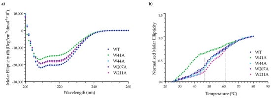 The CD spectra of the variant PMs were similar to the spectrum of WT PMs and were characteristic of a protein with a high α-helical content (Figure S3) [43]. For the mutant PC portal rings, there was a slight decrease in the secondary structure of the W44A, W207A and W211A PC portal rings when compared to the spectrum of WT PC portal rings (Figure 5a). The loss of α-helical secondary structure observed for the W41A PC portal rings was expected given the high monomer content of the sample [43].