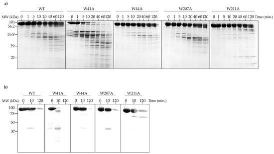 To further test the effects of the tryptophan substitutions on the stability of PC portal rings, limited proteolysis experiments were performed. WT and mutant PC portal rings were incubated with α-chymotrypsin for 120 min at room temperature (~22 °C) or 37 °C. Samples were taken at various times and analyzed by SDS-PAGE. Only the data collected at 37 °C are shown, as the RT data were similar. An analysis of the SDS-PAGE gel indicates that after 20 min, the W41A PC portal protein was completely degraded into smaller peptides, which was an expected result given the high ratio of monomers to rings obtained after the purification of this mutant (Figure 6a). The WT and other variant PC portal rings were not completely digested even after 120 min (Figure 6a), and the respective patterns of cleavage for WT, W44A and W207A portal rings were similar, demonstrating that the same regions were available for digestion. In contrast, α-chymotrypsin did not efficiently degrade the W211A PC portal rings, as fewer peptide fragments were generated over the two-hour time course (Figure 6a). Western blot analysis revealed that the C-terminus of the W211A mutant was more resistant to proteolytic cleavage (Figure 6b). The results for WT PC portal rings were consistent with previously published data [43]. However, these data indicate that W211A PC portal rings were more stable than WT PC portal rings.