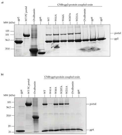 Gp2 is displaced from the portal protein by the tail factor gp4 once genome packaging is complete [52]. Gp4 functions to stabilize the portal protein and protect against genome loss by acting as the head-to-tail adapter; hence, it is critical to the formation of infectious progeny virions [53]. We performed a pull-down assay using gp4-coupled agarose beads to assess whether the alanine substitutions affected the ability for gp4 to associate with PC portal rings in vitro. The W41A variant was the only mutant unable to bind gp4 (Figure 7b), which was an expected result based on previous work showing that gp4 does not interact with PMs in vitro [19,53].