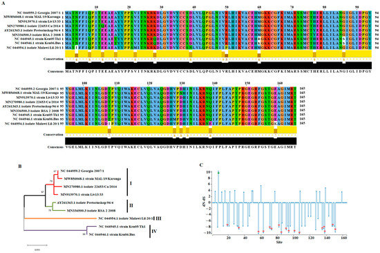 Phylogenetically, it was possible to classify the E165R gene in four main genetic groups (I to IV). In the case of Georgia 2007/1 strain, we found the highest level of identity (~99.46%) with strains MAL/19/Karonga, Liv13/33 and 22653/Ca/2014. Conversely, the lowest levels of identity were predicted against strains associated with groups III and IV (~94.24) (Figure 1B).