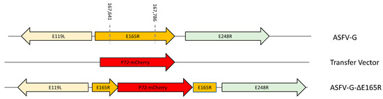 Schematic for the development of ASFV-G-∆E165R. The recombinant vector contains the p72 promoter and an mCherry cassette; the gene positions are indicated. The homologous arms were designed to have flanking ends to both sides of the deletion/insertion cassette. The nucleotide positions of the area that was deleted in the ASFV-G genome are indicated by the dashed lines. The resulting ASFV-G-∆E165R virus with the cassette inserted is shown on the bottom.