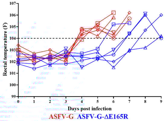 Once it was established that ASFV-G-∆E165R replicates in swine macrophage cultures as efficiently as the parental virus ASFV-G, it was important to evaluate the effect of deleting the E165R gene from the genome of ASFV-G in virulence in swine. A group of five domestic pigs was experimentally infected by IM inoculation of 102 HAD50 of ASFV-G-∆E165R. The clinical evolution of that group was monitored for 28 days and compared with that of a control group, which was also IM inoculated but with 102 HAD50 of ASFV-G. As expected, all animals inoculated with virulent ASFV-G presented an increase in body temperature (over 104 °F) on day 4 pi that rapidly progressed to a full clinical disease (depression, anorexia, staggering gait, diarrhea, and purple skin discoloration) (Figure 4 and Figure 5) with all animals euthanized by day 6–7 pi.