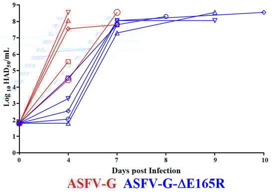 The replication in the animals of either ASFV-G-∆E165R or ASFV-G was evaluated by assessing viremia titers throughout the experimental period (Figure 6). As expected, viremias in animals inoculated with parental ASFV-G had high titers (ranging from 104.3–108.55 HAD50/mL) at day 4 pi, remaining high until the day all animals were euthanized. Viremias in animals inoculated with ASFV-G-∆E165R ranged from undetectable levels to 104.55 HAD50/mL by day 4 pi. They reached high virus titers (between 107.13–107.8 HAD50/mL) by day 7 pi and remained high until all animals required euthanasia due to the severity of clinical disease. Therefore, viremia titers reflect the subtle differences in the clinical presentation of disease between animals inoculated with ASFV-G-∆E165R and parental ASFV-G.