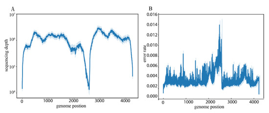 Overall description of the sequencing information in this study (mean lines with confidence interval bands). Dark blue represents the mean line, and light blue areas represent confidence intervals. (A) Sequencing depth along the genome coordinate. (B) Sequencing error rate along the genome coordinate.
