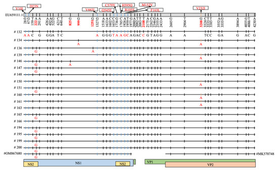 Mutations in the 18 FPV consensus sequences in this study and closely related VP2 (#MK570748) and NS1 (#OM867680) gene sequences in comparison with the FPV reference genome (EU659111). The nucleotide position is indicated in the bar at the top of the figure, together with changes in amino acid sequence, and the character state of individual nucleotides is indicated below for each consensus sequence. Synonymous mutations are indicated by black vertical bars, and nonsynonymous mutations are indicated by blue or orange vertical bars, corresponding to the relevant gene segment indicated at the bottom of the figure. Nucleotides of other sequences that are the same as for sample #132 are indicated by a vertical bar. A total of 10 nonsynonymous mutations (9 nucleotide positions were involved) were identified (NS1/NS2: Val10Ile, Asp23Asn; NS1: Val443Ile, Gln545Glu, Cys579Tyr, His595Gln; NS2: Arg105Ser, Met152Val, Phe163Leu; VP1/VP2: Val232Ile). The six nucleotide diversity positions (222, 825, 999, 1251, 2108, and 3208) are indicated by red font on the genome bar at the top of the figure.
