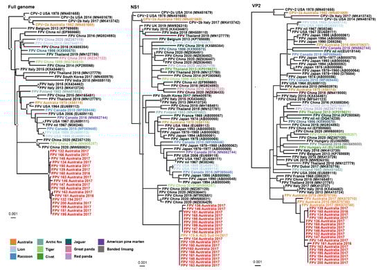 For phylogenetic trees based on the whole genome, NS1 and VP2, strains were mainly clustered by country and year of isolation. The 18 FPV sequences we examined were clustered closely in a single clade (Figure 4) and were most closely related to Australian viruses from the same region over a similar time frame. Because there are more polymorphic positions in NS1 than in VP2, there was a bootstrap-supported subclade of FPVs in this study in the phylogenetic tree for NS1 but not for VP2. In the whole genome and NS1 phylogenies, the viruses most closely related to the Australian FPVs were from a tiger and domestic cats in 2019 and 2020 from China that fell in a clade with high bootstrap support. In the VP2 tree, apart from an Australian virus collected from a domestic cat in 2018, the most closely related viruses were from domestic cats in Italy.