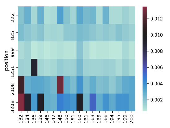 Heatmap of the subconsensus variant frequencies (SVF) in six diversity positions. SVF are displayed as colours ranging from blue to dark red. SVF was <1% in six positions in all samples, except for two positions in two samples (2108: #132 (SVF = 1.1%), #148 (SVF = 1.3%); 3208: #132 (SVF = 1.3%)).