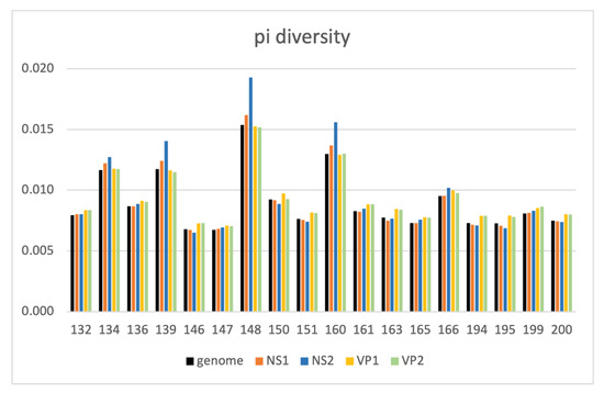 Nucleotide diversity, defined as the average number of nucleotide differences between the same regions in a sample (population) (i.e., π or pi diversity), was used to measure the degree of polymorphism in a sample. For each sample, we quantified π along the FPV genome (excluding the LCRs) and for each gene (Supplementary Materials Figure S2). The whole genome within-sample π diversity varied between 0.7% and 1.5%. A pi diversity of >1% was observed in four samples (#134, #139, #148, and #160). The highest pi diversity (1.9%) was observed in the NS2 gene for sample #148 (Figure 5, Supplementary Materials Table S4).