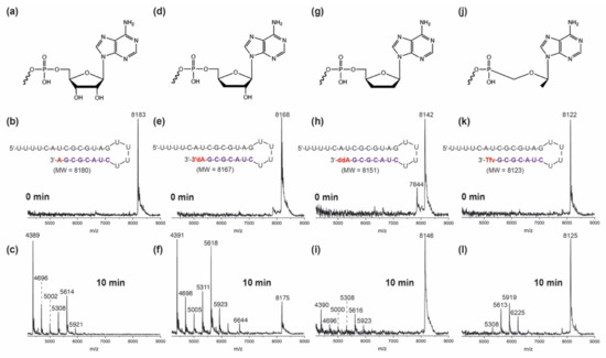 As shown in Figure 2, adenosine- (a), Cordycepin- (d), dideoxyadenosine- (g) or Tenofovir-terminated RNA (j) were separately incubated with the SARS-CoV-2 pre-assembled exonuclease complex (Nsp14/Nsp10) at 37 °C for 0 and 10 min, and the results were analyzed by MALDI-TOF mass spectrometry. The spectra in the middle (Figure 2b,e,h,k) reflected the molecular weights of the corresponding intact RNAs. After 10 min of exonuclease treatment, the RNA products were re-analyzed by MS, and the results are shown in Figure 2c,f,i,l. As an example, the peak at 8168 Da corresponds to the Cordycepin-terminated RNA before exonuclease treatment (Figure 2e). Exonuclease activity caused nucleotide cleavage from the 3′-end of the Cordycepin-terminated RNA, as shown by the eight lower molecular weight fragments corresponding to cleavage of 5–13 nucleotides (Figure 2f), with about 10% intact RNA remaining (peak at 8175 Da), indicating some level of ExoN resistance. Similarly, ddA- and Tenofovir-terminated RNAs were analyzed before (Figure 2h,k) and after ExoN treatment (Figure 2i,l). Approximately 60% and 55% of intact RNAs were observed, respectively (Figure 2i,l), indicating that both nucleotide analogues have substantial ExoN resistance. As a control, the intact adenosine-terminated RNA peak (around 8183 Da, Figure 2b) was not observed after treatment (Figure 2c), indicating that the natural nucleotide A is completely removed by the Nsp14/10 complex. By comparing spectra (Figure 2c,f,i,l), we concluded that ddA- and Tenofovir-terminated RNAs exhibit high resistance toward ExoN cleavage while Cordycepin-terminated RNA displays moderate resistance.