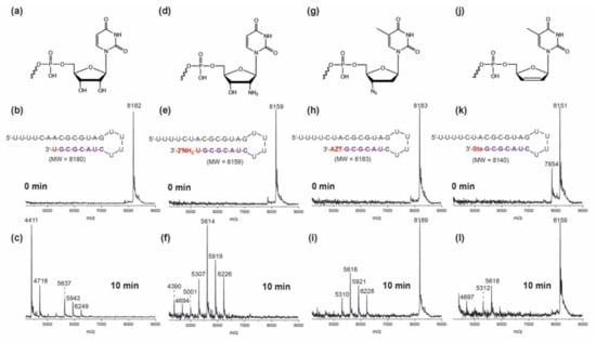 Figure 3 and Figure S3 present the SARS-CoV-2 exonuclease results for uridine- and uridine analogue-terminated RNAs. The MALDI-TOF MS spectra of RNAs extended with 2′-NH2-2′-dUTP, Zidovudine-TP, Stavudine-TP, Biotin-16-UTP and Biotin-16-dUTP are shown in Figure 3e,h,k and Figure S3b,e. After incubation with the SARS-CoV-2 Nsp14/10 complex, only Zidovudine- and Stavudine-terminated RNAs retain ~40% and 50% of their respective intact RNA peaks (Figure 3i,l). These results indicate that Zidovudine- and Stavudine-terminated RNAs have substantial exonuclease resistance. In the control spectrum of exonuclease-treated uridine-extended RNA (Figure 3c), no intact RNA was observed, with the majority of fragments being 14–15 nucleotides long, indicated by the major peaks at 4411 Da and 4718 Da. After treatment with ExoN, the intact peak for the 2′-NH2-2′-dU-terminated RNA is eliminated, with mainly fragments of 18–21 nucleotides remaining (Figure 3f), indicating very low resistance to ExoN. The Biotin-16-U- and Biotin-16-dU-terminated RNAs (Figure S3c,f) also displayed very low resistance toward ExoN activity, with the intact RNA peak completely eliminated, with predominantly 18–21 nucleotide long fragments remaining.