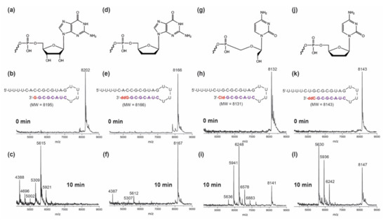 The results for RNAs terminated with cytosine and three additional cytosine analogue-terminated synthetic RNAs were treated with SARS-CoV-2 exonuclease and are depicted in Figure S4. After treatment with ExoN for 10 min, the intact RNA peaks measured at time 0 (Figure S4e,h,k) were no longer observed for 2′-dC-, 2′-F-2′-dC- and 2′-OMe-C-terminated RNAs (Figure S4f,i,l). Compared to the control result for cytosine-terminated RNA (Figure S4c), these cytosine analogue-terminated RNAs did not demonstrate any notable resistance to exonuclease activity (Figure S4f,i,l).