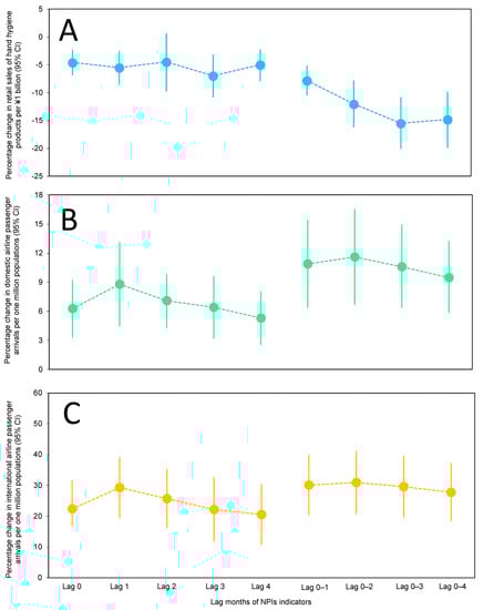 Overall percentage change (mean and 95% CI) in seasonal influenza activity associated with an increase of 1-unit change in alternative indicators of NPIs at different lags at the national level in Japan during 2014–2020. (A) Percent change in retail sales of hand hygiene products per ¥1 billion at the national level in Japan during 2014–2020 for monthly seasonal influenza activity. (B) Percent change in the number of domestic airline passengers per one million population at the national level in Japan during 2014–2020 for monthly seasonal influenza activity. (C) Percent change in the number of international airline passengers per one million population at the national level in Japan during 2014–2020 for monthly seasonal influenza activity. Whiskers show 95% confidence intervals (CIs). The relevant estimates (coefficients, 95% CIs, and p-values) for this figure are provided in Table S3.