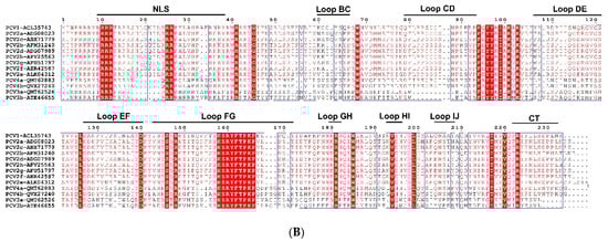Sequence characteristics of PCV. (A) Genomic characteristics. The unique sequence of PCV1, PCV2, PCV3, and PCV4 were labeled green, red, gray, and blue, respectively. The conserved motif was marked by yellow. (B) Amino acids sequence alignment of PCV Capsid. The amino acid sequence alignments were performed with an online tool (https://www.genome.jp/tools-bin/clustalw, accessed on 5 April 2022) and shown by Espript 3.0 (https://espript.ibcp.fr/ESPript/cgi-bin/ESPript.cgi, accessed on 5 April 2022). The NLSs of Cap protein were predicted with NLStradamus (https://www.novopro.cn/tools/nls-signal-prediction.html, accessed on 5 April 2022). Moreover, loop regions of Cap protein were predicted with SOPMA (https://npsa-prabi.ibcp.fr/cgi-bin/npsa_automat.pl?page=/NPSA/npsa_sopma.html, accessed on 5 April 2022).