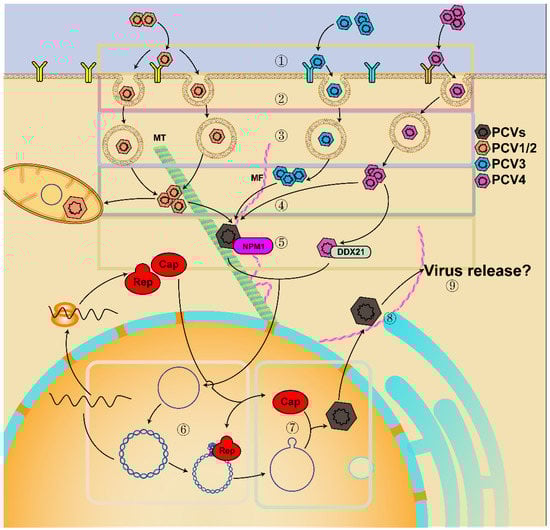 Model of PCV lifecycle. ① PCV attaches to HS and/or other receptors; ② PCV enters cells via clathrin-mediated endocytosis, macropinocytosis, or actin and Rho-GTPase dependent manner; ③ PCV is transported in the endosome–lysosome and uncoated by serine protease in a low pH-dependent way or a neutral pH-dependent manner; ④ release from the endosome into the cytoplasm in a low pH-dependent manner; ⑤ translocation into the nucleus by interacting with tubulin, microtubules (MT), microfiber (MF), NPM1, and DDX21; ⑥ rolling-circle replication; ⑦ the newly synthesized Cap is transported into the nucleus for genome encapsidation and assembly in a near-neutral pH; ⑧ virion transportation to the cytoplasm and shuttle between mitochondria and nucleus; ⑨ virion release.