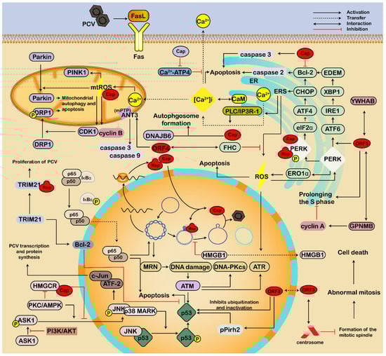 ERS and apoptosis are regulated by the interaction of PCV and host factors. PCV stimulates ERS and ROS via the interaction of viral proteins (Cap, Rep, ORF5) and host proteins associated with PERK pathways (including PERK-eIF2α-ATF4-CHOP, PERK-ATF6-IRE1-XBP1, PERK-ERO1α), which upregulates caspases, interferes with the homeostasis of intracellular Ca2+ in mitochondria and ER, and leads to autophagic and apoptotic responses. Additionally, PCV induces translocation and activation of Parkin and DRP1 to mitochondria, resulting in mitochondrial autophagy and apoptosis. The ORF4 induces caspase-3- and -9-dependent apoptosis by interacting with mitochondrial ANT3 of the mPTP, resulting in the increase in mitochondrial permeabilization and the efflux of apoptogenic factors. However, the ORF4 also interacts with the viral Rep to inhibit viral replication and interacts with FHC in the cytoplasm to reduce cellular FHC and ROS, thus antagonizing the apoptosis. Furthermore, PCV enhances the activation of NF-κB, the phosphorylation of JNK and p38 MAPKs, and the degradation of pPirh2, thus promoting the stability and phosphorylation of p53 and leading to cell apoptosis. The ORF3 protein accumulates in the nucleus and competes with p53 to bind porcine ubiquitin E3 ligase pPirh2, destabilizing pPirh2 to enhance p53. In addition, the ORF3 interacts with the centrosome, thus destroying the mitotic spindle, leading to abnormal mitosis in cells. Moreover, host proteins such as MRN complex, GPNMB, YWHAB, CDK1, and PINK1, are also involved in ERS, mtROS, and apoptosis or restrict virus infection. At the same time, PCV activates PI3K/Akt, MAPKs, PKC, and AMPK pathways by interacting with several host proteins such as TRIM21, Bcl-2, FHC, DNAJB6, and HMGCR, thus inhibiting apoptosis and facilitating virus proliferation. Meanwhile, PCV2 infection causes the prolongation of the S phase and nuclear export of HMGB1. Thereby, cell survival and viral replication are enhanced. Therefore, there is homeostasis between PCV-induced apoptosis and anti-apoptosis to maintain survival and persistence of PCV infection.