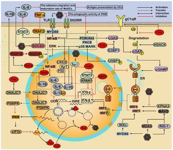Immune response and inflammatory reactions regulated by the interaction of PCV and host factors. PCV infection can not only activate the production of IFNs but also inhibit IFNs, forming complex crosstalks between host proteins and PCV2, leading to immunosuppression and persistent infection. During infection, the viral Cap inhibits ubiquitin-mediated proteasomal degradation of cellular C1QBP (gC1qR), thus enhancing the phagocytic activity through the PI3K pathway. The interaction of viral Cap and host C1QBP also promotes phosphorylation of cGAS via PI3K/Akt and PKCδ signal pathways, leading to the release of cGAMP, dimerization, and translocation of STING into the nucleus, and thus an enhancement of type I IFN production. Additionally, PCV2 activates RIG-1/MDA-5/MAVS/IRFs and MyD88-IKKα-IRFs pathways to enhance the type I IFN responses. On the contrary, HDAC6 mediates the ubiquitination of cGAS to degrade cGAS in autolysosomes. Furthermore, PCV blocks the nuclear translocation of p-IRF3 by destroying the interaction between KPNA and p-IRF3 and inactivating STING through the p38-MAPK pathway, thus inhibiting the induction of type I IFN. Moreover, PCV modulates inflammatory responses through PI3K/Akt, p38 MAPK, and NF-κB pathways to inhibit antiviral responses and the maturation of immune cells. Activation of the NF-κB pathway is critical for inflammatory reactions during PCV infection. The interaction between viral Cap and host C1QBP induces the activation of PI3K/Akt and p38 MAPK signals, thus enhancing the production of IL-10. In addition, PCV2 induces IL-8, IL-1β, and IL-10 via the TLR/MyD88/NF-κB signaling pathway. Moreover, the RGS16 interacts with viral ORF3 protein and participates in the nuclear transport of the ORF3. However, the interaction between virus ORF3 and RGS16 in the cytoplasm also causes ubiquitination and proteasomal degradation of RGS16, which further enhances nuclear entry of NF-κB through the ERK1/2 signaling pathway and increases IL-6 and IL-8. On the contrary, PCV2 enhances the interaction of the SOCS3 and STAT3/TRAF2, resulting in the downregulation of secreted IL-6 and TNF-α signaling, further decreasing the maturation of MoDCs and antigen presentation by DCs. The PKR signaling pathway activates eIF2α to inhibit virus protein. However, the viral cap can interact with DNAJC7 to inhibit the activation of PKR.