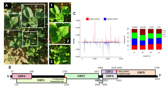 Characterization of the soybean chlorotic leafroll virus (SbCLRV) genome. (A) The chlorotic and leafroll symptoms represented on the soybean plant infected by SbCLRV. An overall view of the whole plant. Closer photographs (1, 2 and 3) focus on the symptomatic leaves, which showed curling in all the leaves (1, 2 and 3) and chlorosis in the downward leaves (3). (B) Schematic representation of the genomic organization of the SbCLRV. The positions of −1 ribosomal frameshift site in ORF1 and the stop codon for ORF3 readthrough were marked as red asterisks. (C) Distribution profile of the vsiRNAs that revealed multiple hotspots along the SbCLRV genome. The red and blue color represent the reads on the viral strand or viral complementary strand, respectively. The 5′-nucleotide bias of the vsiRNAs that matched the SbCLRV genomic sequence has been detailed in the histogram. Histogram bars represent the percentage of each of the four nucleotides, and the color code is detailed in the legend.