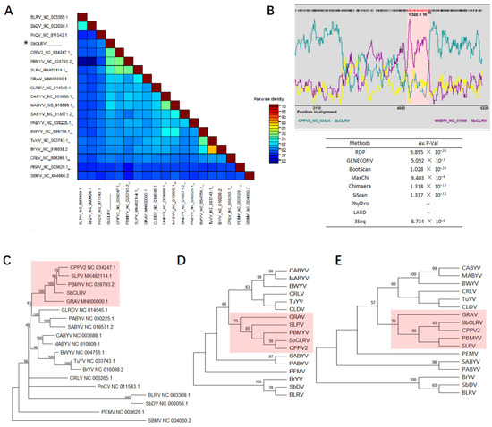 Phylogenetic analyses of the soybean chlorotic leafroll virus (SbCLRV) and selected members of the family Solemoviridae. (A) The pairwise identities plot of complete genomic nucleotide sequences aligned by MAFFT and displayed by sequence demarcation tool (SDT) software; (B) RDP3 analysis on the recombination event of these members. The peaks in pink zone represent the recombination events of SbCLRV with melon aphid-borne yellows virus and cotton leafroll dwarf virus in positions 5337–5578 nt and 5034–5255 nt, respectively; phylogenetic analyses of selected viruses based on the nucleotide sequences of (C) complete genome (model GTR + G + I) and amino acid sequences of the proteins (D) P1–P2 (RdRp) (model WAG + G) and (E) P3 (CP) (model JTT + G). The phylogenetic tree was constructed using the maximum likelihood (ML) method with 1000 bootstrap replications. The Genbank accession numbers for these genome sequences are listed in Table S3.