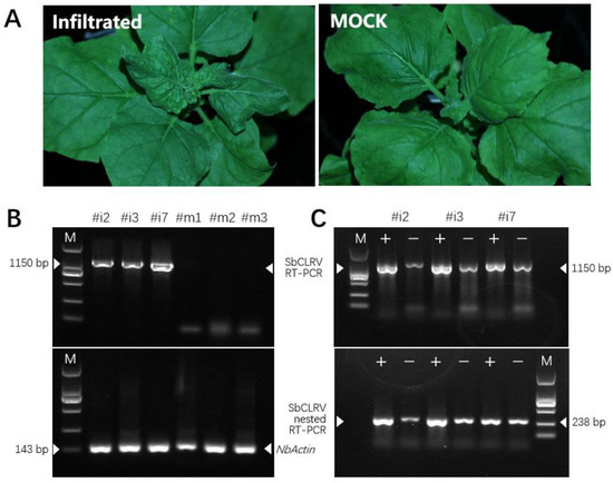 For agroinfiltration, we first introduced the pCass-SbCLRV into the Agrobacterium tumefaciens strain GV3101. The transformed agrobacteria were infiltrated into the abaxial surface of the Nicotiana benthamiana seedlings leaves. Mock infiltrations were conducted with the pCass-RZ empty vector-transformed A. tumefaciens cells. The inoculated plants were kept in a greenhouse under condition 16/8 h (light/dark) photoperiod for symptoms to develop. After obvious symptoms developed in the systemically infected leaves, symptomatic tissues were detected by RT-PCR with viral-specific primers pXT297/pXT298 (Table S1). NbActin was used as an internal control to normalize the RNA level [19]. PCR products were analyzed on a 2% agarose gel.