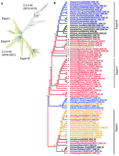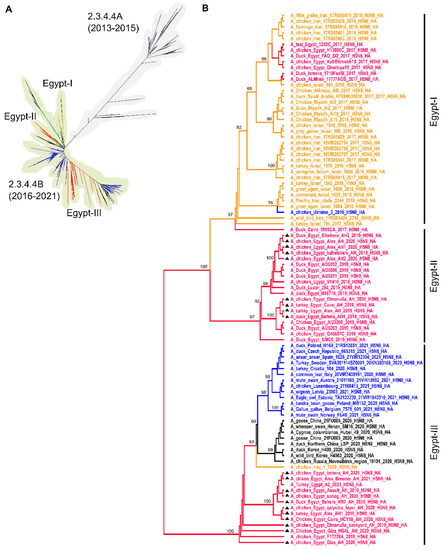 - Abdelwhab, E.M.; Hassan, M.K.; Abdel-Moneim, A.S.; Naguib, M.M.; Mostafa, A.; Hussein, I.T.M.; Arafa, A.; Erfan, A.M.; Kilany, W.H.; Agour, M.G.; et al. Introduction and enzootic of A/H5N1 in Egypt: Virus evolution, pathogenicity and vaccine efficacy ten years on. Infect. Genet. Evol 2016, 40, 80–90. [Google Scholar] [CrossRef]