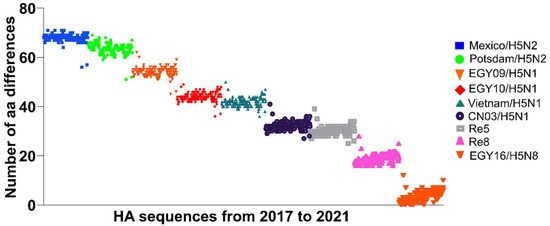 - Cattoli, G.; Milani, A.; Temperton, N.; Zecchin, B.; Buratin, A.; Molesti, E.; Aly, M.M.; Arafa, A.; Capua, I. Antigenic drift in H5N1 avian influenza virus in poultry is driven by mutations in major antigenic sites of the hemagglutinin molecule analogous to those for human influenza virus. J. Virol. 2011, 85, 8718–8724. [Google Scholar] [CrossRef] [Green Version]