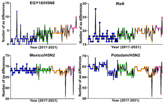 - Amer, F.; Li, R.; Rabie, N.; El-Husseiny, M.H.; Yehia, N.; Hagag, N.M.; Samy, M.; Selim, A.; Hassan, M.K.; Hassan, W.M.M.; et al. Temporal Dynamics of Influenza A(H5N1) Subtype before and after the Emergence of H5N8. Viruses 2021, 13, 1565. [Google Scholar] [CrossRef] [PubMed]