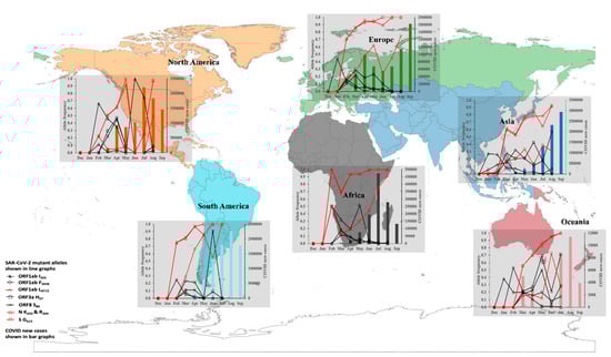 The majority of the orf1ab mutant alleles were detected infrequently with prevalences below 25% during the early phase of the pandemic, i.e., Feb–May 2020, and thereafter declined sharply as transmission peaked in all the six continents (Figures S7–S10). In contrast, eight mutant alleles were detected at prevalences above 35% and recurred from February to September 2020 in all six continents (Figure 1). They included three in the replicase polygene, orf1ab-I265 (located in NSP2; an endosome-associated protein that interacts with host proteins), F3606 (located in NSP5; encodes the 3CL protease that cleaves the ORF1ab polyprotein), and L4715 (located in NSP12; encodes RNA-dependent RNA polymerase, i.e., RdRP, involved in viral replication). The remaining five included two in the accessory proteins, orf3a H57 and orf8 S84, and three in two structural genes, S G614 and N KR203&204 (this genotype defines variants in the GR clade). These mutant alleles have been associated with infectivity, disease severity, and immune dysregulation [12,15,17,38] and have been detected in VOCs including the Delta variants [39,40]. In particular, four VOC-defining mutant alleles, orf1ab L4715, S G614, and N KR203&204 [16], rose sharply in prevalence from <6% in February 2020 to >90% in August 2020 (Figure 1). This rise coincided with the period when COVID-19 cases, associated with the Delta variant, peaked globally [41], suggesting that these mutant alleles confer a higher transmission advantage than wild-types [19]. Interestingly, ~1% of the Australian genomes sampled in June 2020 carried the S Y501 mutant allele, which was associated with high infectivity among UK variants that caused nationwide outbreaks in September 2020 [42]. Our data suggest that the S N501Y mutation emerged earlier, possibly May–June 2020, when Australia had its second wave of transmissions [43].