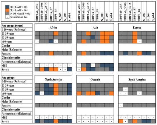 Epidemiology of infection with variant-specific alleles at eight informative loci in SARS-CoV-2 genomes sampled in 2020. The likelihood of patients harbouring an infection that carried a mutant allele at the eight informative loci was compared among patients in different age groups, gender, and geographical regions and patients with different COVID-19 forms. The adjusted odds ratio (OR) with the p-value is depicted with orange, blue, and grey colours corresponding to OR > 1 and p-value < 0.05; OR < 1 and p-value < 0.05; and 1< OR > 1 and p-value > 0.05, respectively. – indicates no data, i.e., the OR was not estimated due to the sample size being less than five.