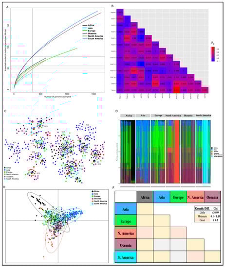 To demonstrate the utility of the multilocus genotyping tool for differentiating SARS-CoV-2 variants responsible for COVID-19, we employed a network analysis, DAPC, and GST to visualise relationships, identify genetic clusters, and to estimate the genetic differentiation among MLG repertoires from the six continents. The network analysis indicated that 11 major clonal complexes (i.e., related MLGs) existed in the “2020 genomes” (Figure 3C). Two of these complexes were unique to Asia (AC1-2) and one was unique to Oceania (OC1); in Australia, a number of SARS-CoV-2 infection clusters were shown to have evolved locally [50]. The remaining eight complexes (GC1-8) consisted of MLGs from the six continents that were indicative of admixture populations (Figure 3D), corroborating previous findings [49]. Among these admixture populations, the DAPC analysis predicted 20–50% relatedness to Asian and Oceanian MLGs (Figure 3D). That is, 20–50% of the alleles in an MLG signature were identical to those in the Asian and Oceanian MLGs. This suggested that the majority of genomes in the global population were related to those from Asia and Oceania. In the early stages of the pandemic, SARS-CoV-2 transmission in Africa was thought to have been seeded by imported cases from America, an assumption that was based on travel data [51,52]. Our DAPC analysis for African MLGs predicted 50–60% relatedness to European MLGs (Figure 3D). As shown in Figure 3D, the majority of the 74 unique African MLGs had 50% of their bars coloured green, representing Europe. In the same plot for Africa, it was observed that <25% of the population membership was assigned to Oceania (indicated in the magenta bar) and Asia (indicated in the blue bar). In summary, these predictions suggest that early transmission in Africa was seeded by infections from multiple geographical origins including Europe. This underscores the need to build strong surveillance systems using both travel and genomic data.