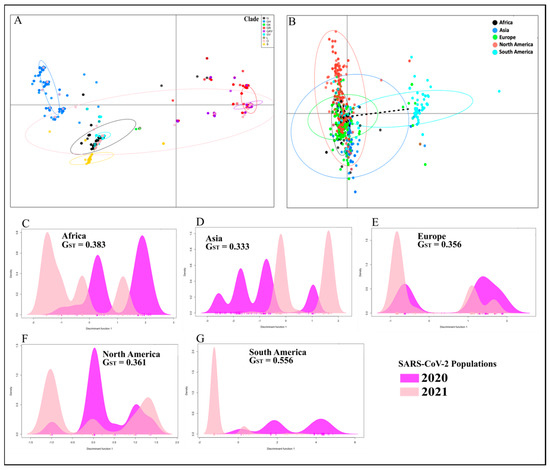 Furthermore, the PCA also separated the MLGs in the “2021 genomes” based on the continent of origin (Figure 4B). The majority of MLGs from South America and a subset of those from North America formed two well-defined clusters whereas European and Asian MLGs clustered with the African MLGs. This pattern of clustering contrasts the pattern observed for the 2020 study population, suggesting that the two viral populations were genetically distinct (Table S5). Indeed, the DAPC analysis indicated the existence of predominant MLGs in the 2020 global population including Africa (number of predominant MLGs = 2; detected in 27.6% of the African genomes sampled), Asia (4; 36.4%), Europe (2; 45.9%), North America (3; 55.1%), and South America (3; 54.4%). These viral populations were genetically differentiated (GST ≥ 0.333) from their respective 2021 viral populations: Africa (3; 66.2%), Asia (2; 54.3%), Europe (2; 70.0%), North America (3; 76.3%), and South America (2; 83.3%) (Figure 4C–G and Table S5). Oceania had three predominant MLGs that accounted for 34.4% of the genomes sampled in 2020 but we could not compare these to the 2021 viral population since no genomes were available between 15 January and 15 March at the time of sampling. Taken together, our findings from the 2020 and 2021 viral genomes suggest that in the different continents, COVID-19 cases in 2020 and 2021 were caused by genetically distinct viral strains that likely adapted to local populations [58].