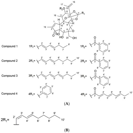 Compound 1: Compound 1 was identified as yuanhuacine A and obtained as a pale-yellow amorphous powder. Based on the UPLC-QTOF-MS/MS analysis, under ESI positive ionisation mode, yuanhuacine A appeared at m/z 621.0960 [M+H]+ with a corresponding molecular formula of C35H40O10 (calculated 621.0360) with 16 degrees of unsaturation, correlating to that observed in the literature [26]. The 1H-NMR spectrum revealed proton signals and 13C atoms which were in accordance with the molecular formula. The 1H-NMR spectrum indicated the presence of four methyl groups at δH 1.89 (3H, br. s, H-17), 1.79 (3H, dd, J = 1.27 Hz, H-19), 1.41 (3H, d, J = 7.69 Hz, H-18), and 0.93 (3H, t, J = 7.3 Hz, H-8′). The presence of a phenyl group was shown by the signals at δH 7.92 (2H, dd, J = 8.2, 8.4 Hz, C-3″ and C-7″), 7.48 (2H, t, J = 8.1, 15.2 Hz, C-4″ and C-6″), and 7.61 (1H, m, C-5″) (Table 1). The DEPT NMR spectrum showed the presence of an α,β-unsaturated ketone at δC 209.50 (C-3). DEPT confirmed the presence of 10 quaternary carbons with a carbon–oxygen bond, six olefinic carbons, and five methylene carbons. The signal at δC 117.10 (C-1′) is an indication of an orthoester moiety formed between C9/C13/C14 at δC 80.50 (C-9), 83.92 (C-13), and 78.96 (C-14). There was an indication of an ester moiety at δC 165.54 (C-1″) and an epoxy ring found at C-6 and C-7 at δC 60.57 and 64.73, respectively. The effect of the α,β-unsaturated ketone resulted in the downfield chemical shift for C-19 at δC 9.90 (Table 1). The presence of three alcohol groups, δC 64.07 (C-20), a primary alcohol; δC 72.17 (C-5), a secondary alcohol; and δC 71.98 (C-4), a tertiary alcohol, were detected. The HSQC and COSY correlation led to the assignment of the proton and carbon signals. The 1H and 13C chemical shifts are shown in Figures S1 and S2, respectively (Supplementary File), where comparisons are drawn with the published literature [26]. Based on these results, the compound was confirmed to be yuanhuacine A (Figure 3A, compound 1).
