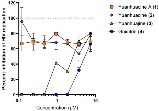 Compounds 1–4 (with compound 2 occurring as an isomeric mixture) were tested next for anti-HIV replication activity in vitro using the deCIPhR assay in dose-response studies (Figure 4). Yuanhuacine A (1) consistently showed a pronounced activity by inhibiting HIV replication (ranging between 65–80%) across all test concentrations (ranging from 0.08 to 5 μg/mL). The cytotoxicity was assessed using Alamar Blue reagent under the same cell culture conditions used for the anti-HIV replication activity. After four days of incubation, there was no evidence of cytotoxicity at any concentration (data not shown). In contrast, yuanhuajine (3) exhibited a calculated EC50 of 1.8 μM (0.002 µg/mL), while gniditrin (4) was observed with an EC50 of 4.0 μM (0.006 µg/mL) and was the least active against HIV replication. All the isolated compounds belong to the genkwanine category of daphnane diterpenoids, with a 9,13,14 ortho-ester motif and a 6α-epoxy having been reported to be contributing factors to anti-HIV replication activity [25]. Gniditrin (4), with the weakest anti-HIV activity, has its phenyl group attached to position R1 and its alkyl (ester) chain linked at R2 [17,28,29]; in contrast, the remaining compounds have their alkyl chain linked in position R1 and the phenyl (ester) substituent linked in position R2 [30,31]. Both yuanhuacine A (1) and yuanhuacine (as an isomeric mixture) (2), with the strongest HIV inhibition, and have a double bond linked in their alkyl chain between carbons C-2′-C-3′ and C-5′-C-6′, while yuanhuajine (3) has an extra double bond between C-7′-C-8′ [25]. The absence of the double bond in yuanhuacine A (1) and yuanhuacine (as an isomeric mixture) (2) could therefore be important toward the anti-HIV activity of these compounds.